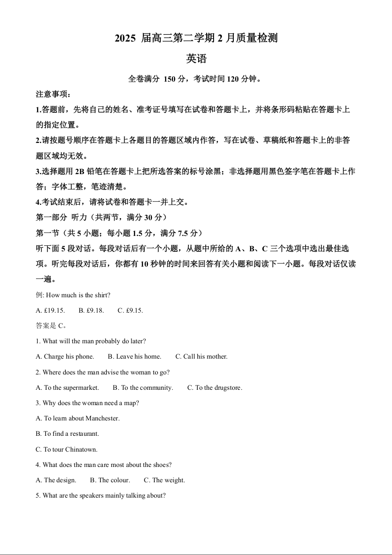 河南省金科大联考2024-2025学年下学期2月高三质量检测英语+答案