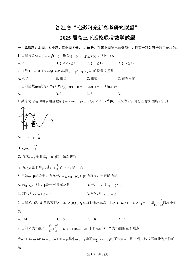 浙江省七彩阳光新高考研究联盟202402025学年下学期2月高三返校联考数学+答案