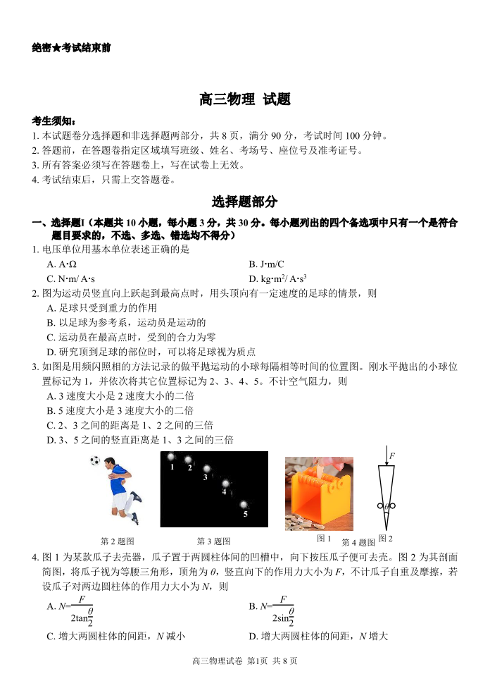 浙江省七彩阳光新高考研究联盟202402025学年下学期2月高三返校联考物理
