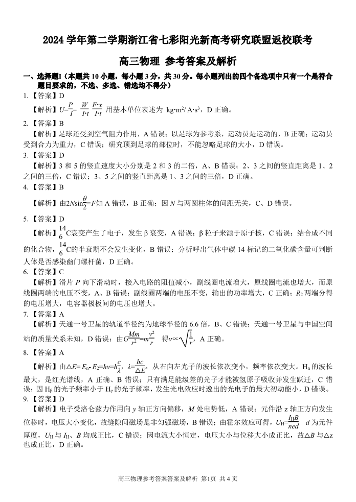 浙江省七彩阳光新高考研究联盟202402025学年下学期2月高三返校联考物理答案