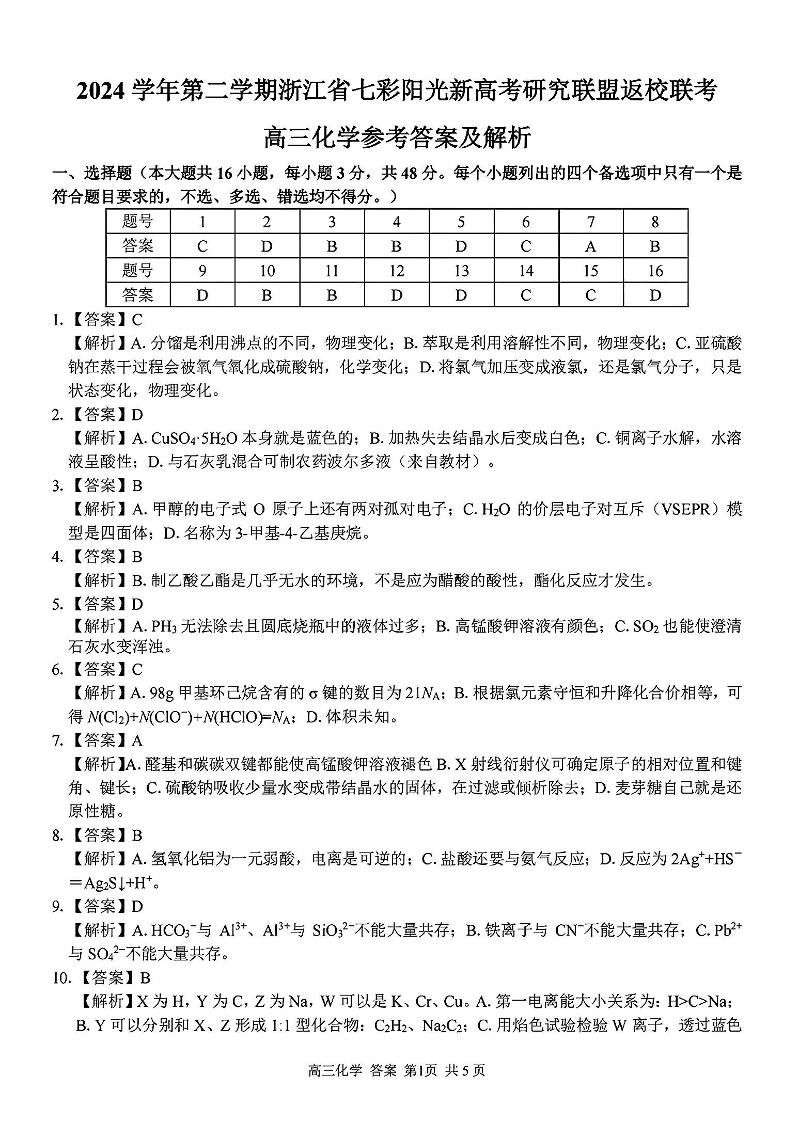 浙江省七彩阳光新高考研究联盟202402025学年下学期2月高三返校联考化学答案