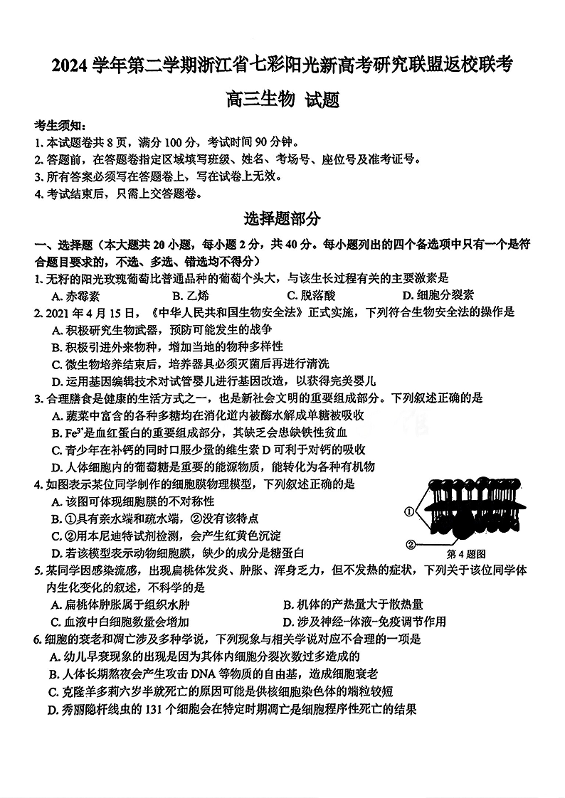 浙江省七彩阳光新高考研究联盟202402025学年下学期2月高三返校联考生物+答案