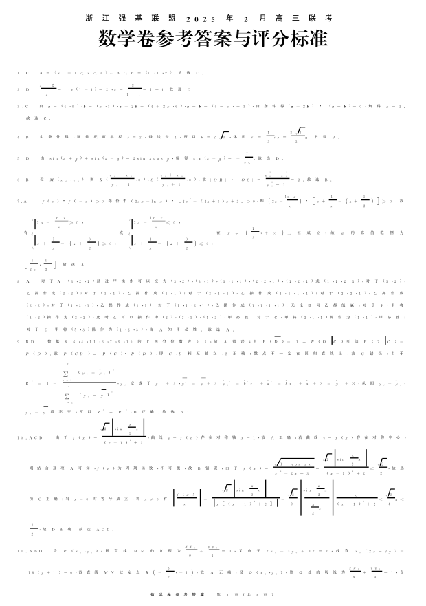 浙江省强基联盟2024-2025学年下学期2月高三返校联考数学答案