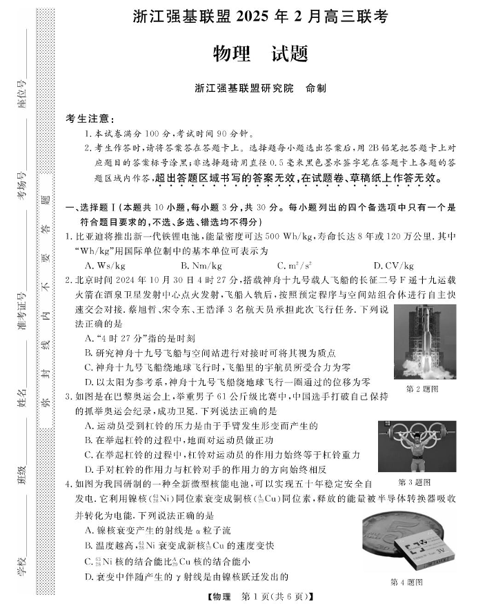 浙江省强基联盟2024-2025学年下学期2月高三返校联考物理