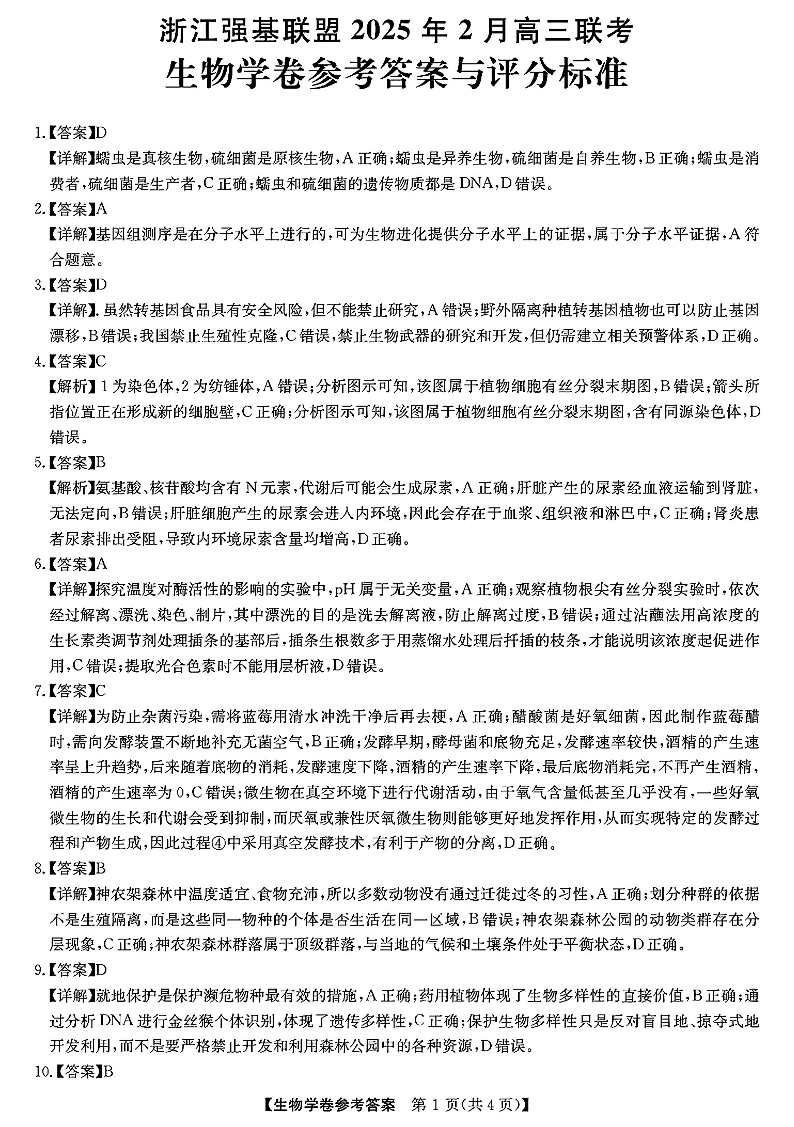浙江省强基联盟2024-2025学年下学期2月高三返校联考生物答案