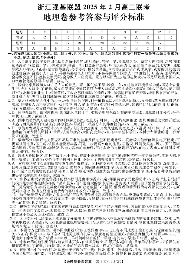 浙江省强基联盟2024-2025学年下学期2月高三返校联考地理答案