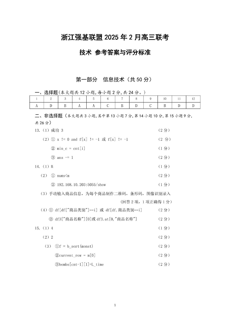 浙江省强基联盟2024-2025学年下学期2月高三返校联考技术答案