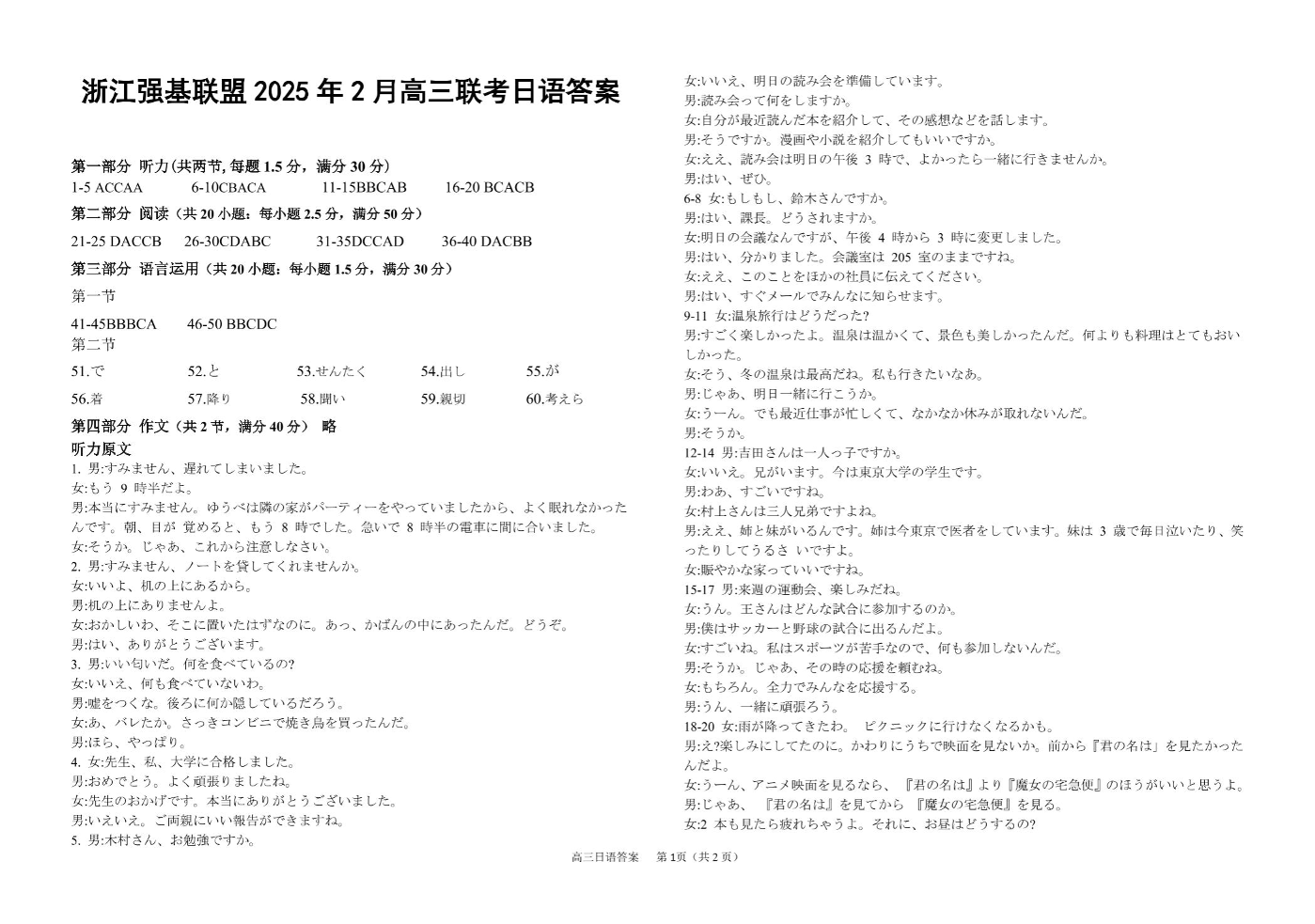 浙江省强基联盟2024-2025学年下学期2月高三返校联考日语答案