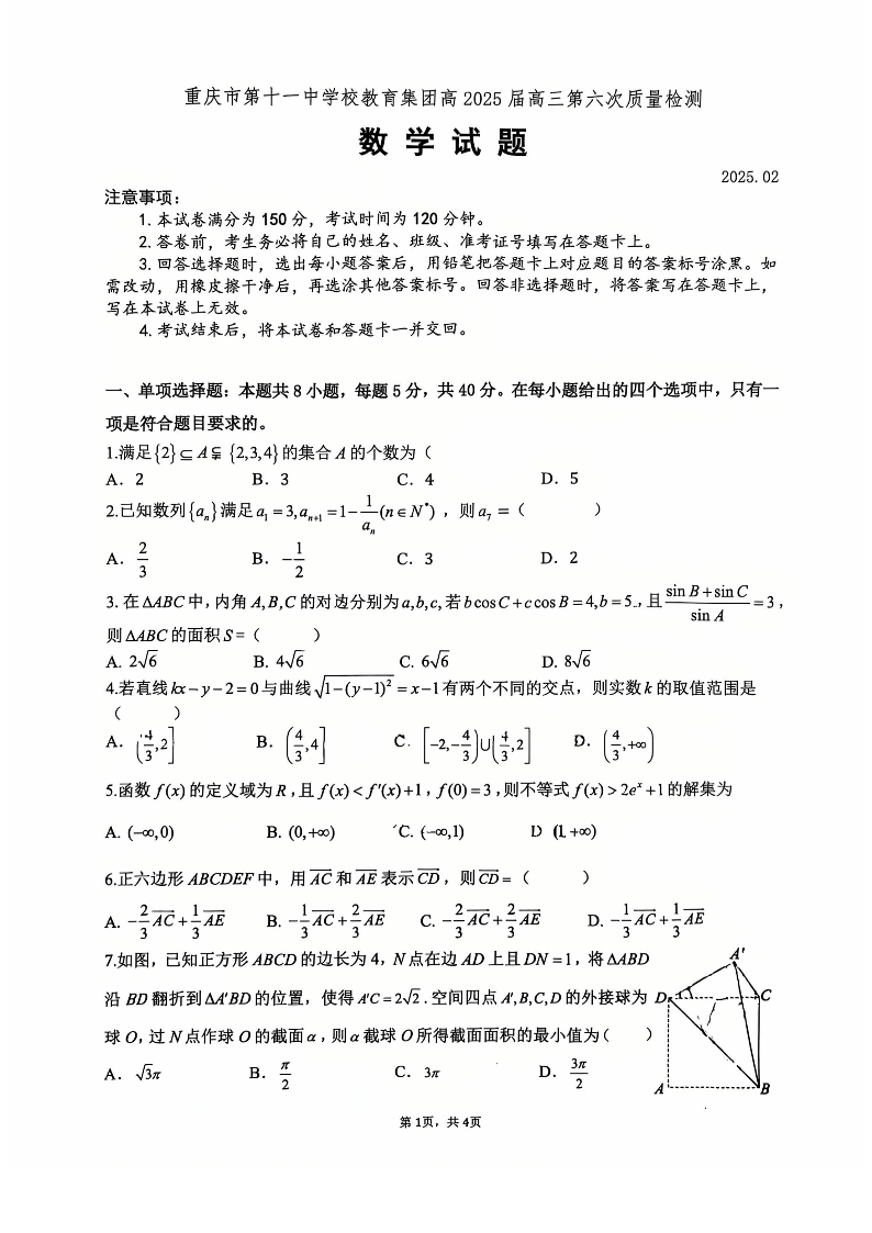 重庆市第十一中学教育集团2024-2025学年高三第六次质量检测数学