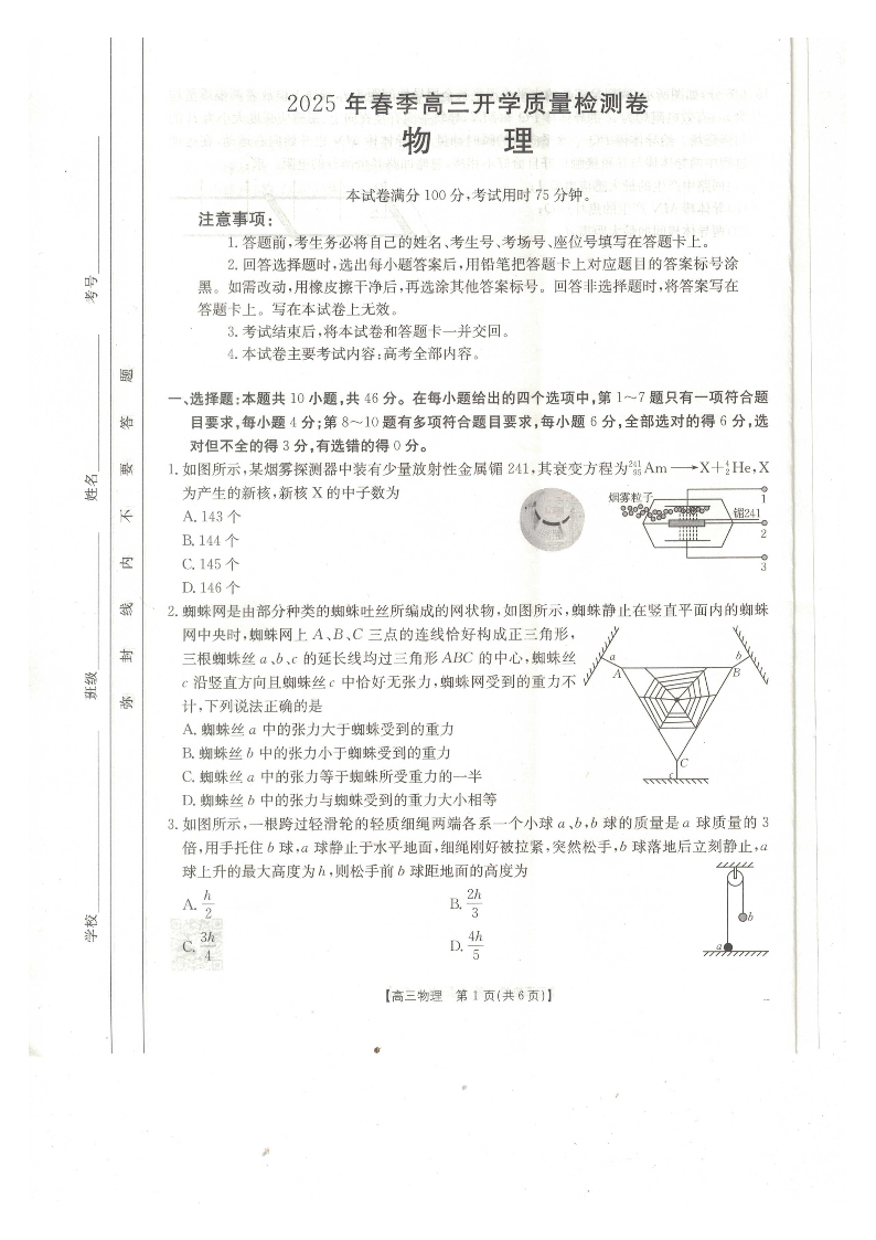 广西壮族自治区桂林市2024-2025春季高三开学质量检测物理