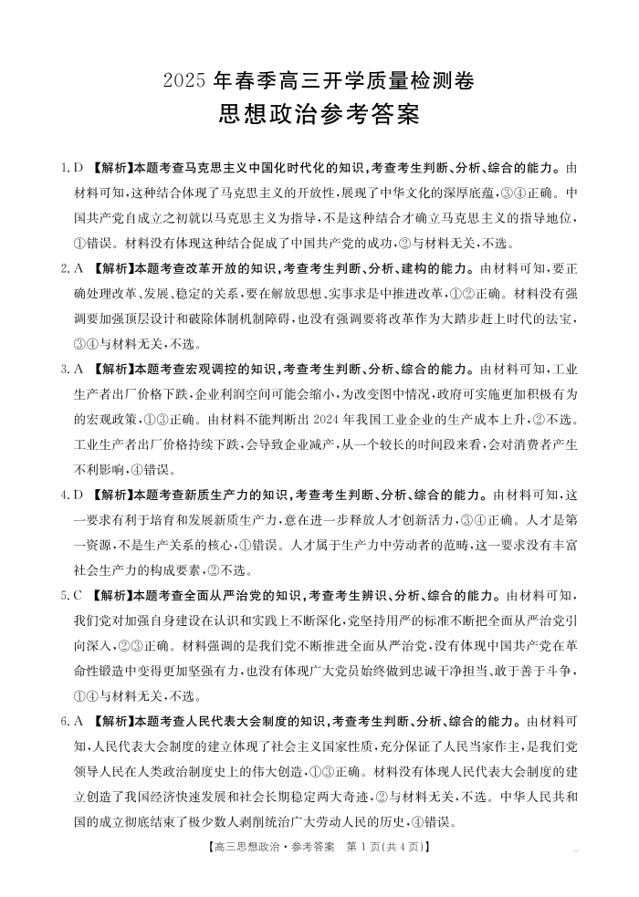 广西壮族自治区桂林市2024-2025春季高三开学质量检测政治答案