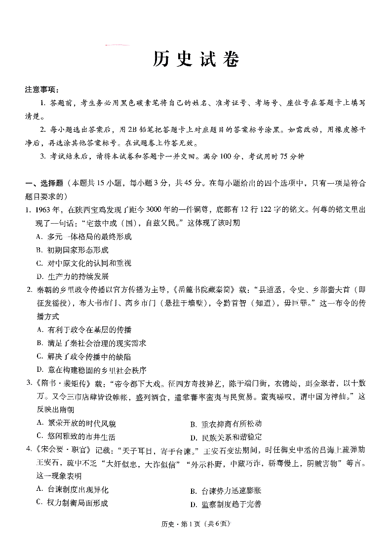 重庆市巴蜀中学2024-2025学年下学期高三适应性月考卷(五)历史