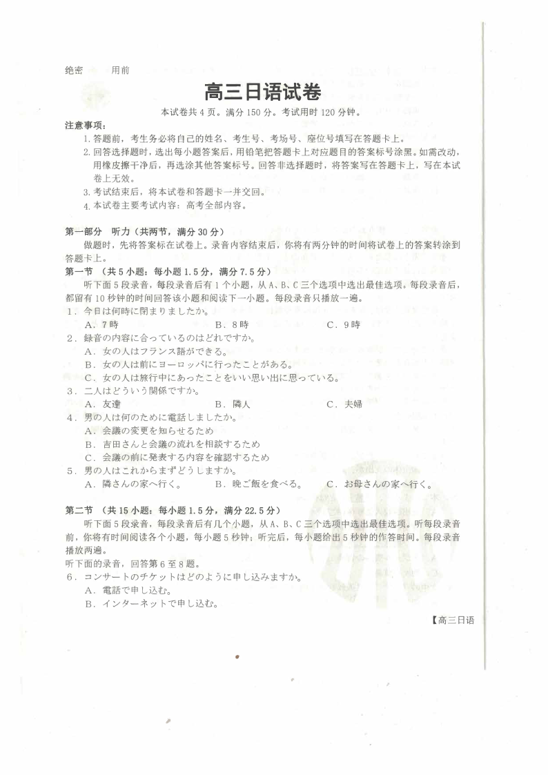 广西壮族自治区桂林市2024-2025春季高三开学质量检测日语
