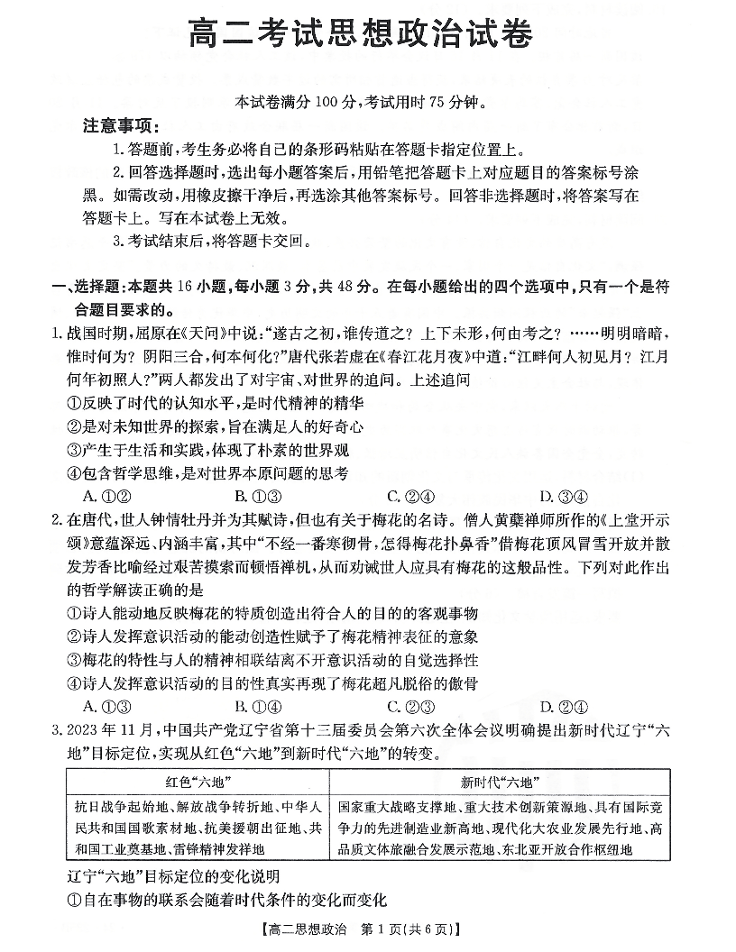 辽宁省辽阳市2023-2024学年高二上学期1月期末考试政治