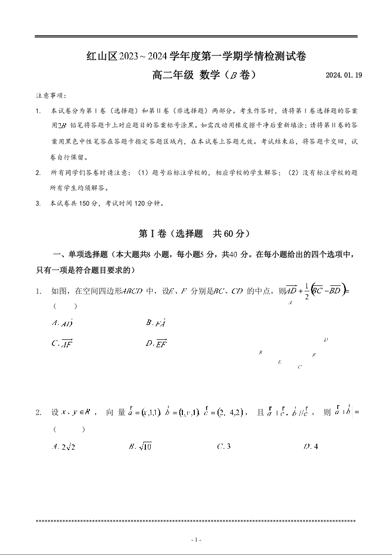 内蒙古赤峰市红山区2023-2024学年高二上学期1月期末考试数学(原卷版)