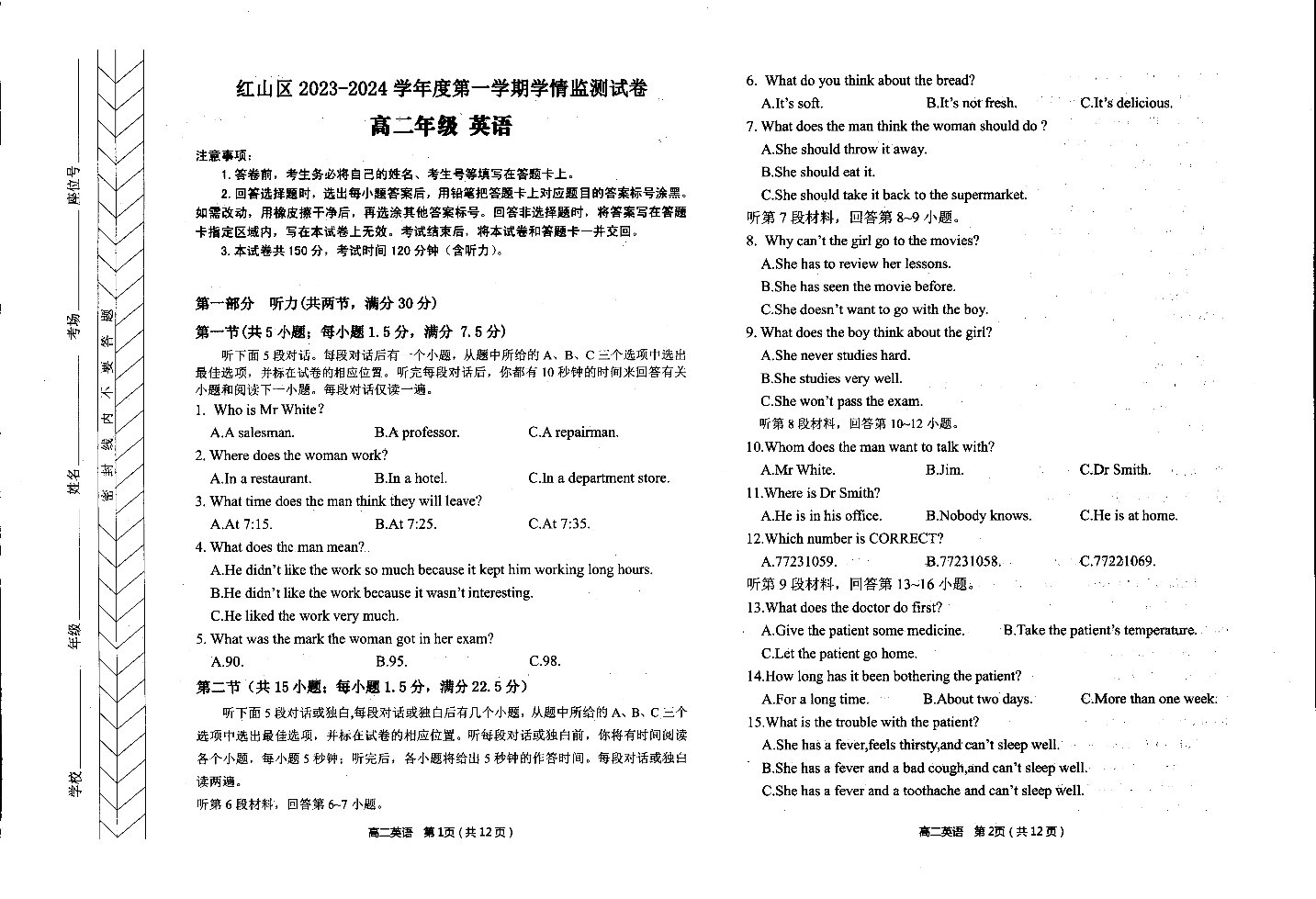 内蒙古赤峰市红山区2023-2024学年高二上学期1月期末考试英语+答案。