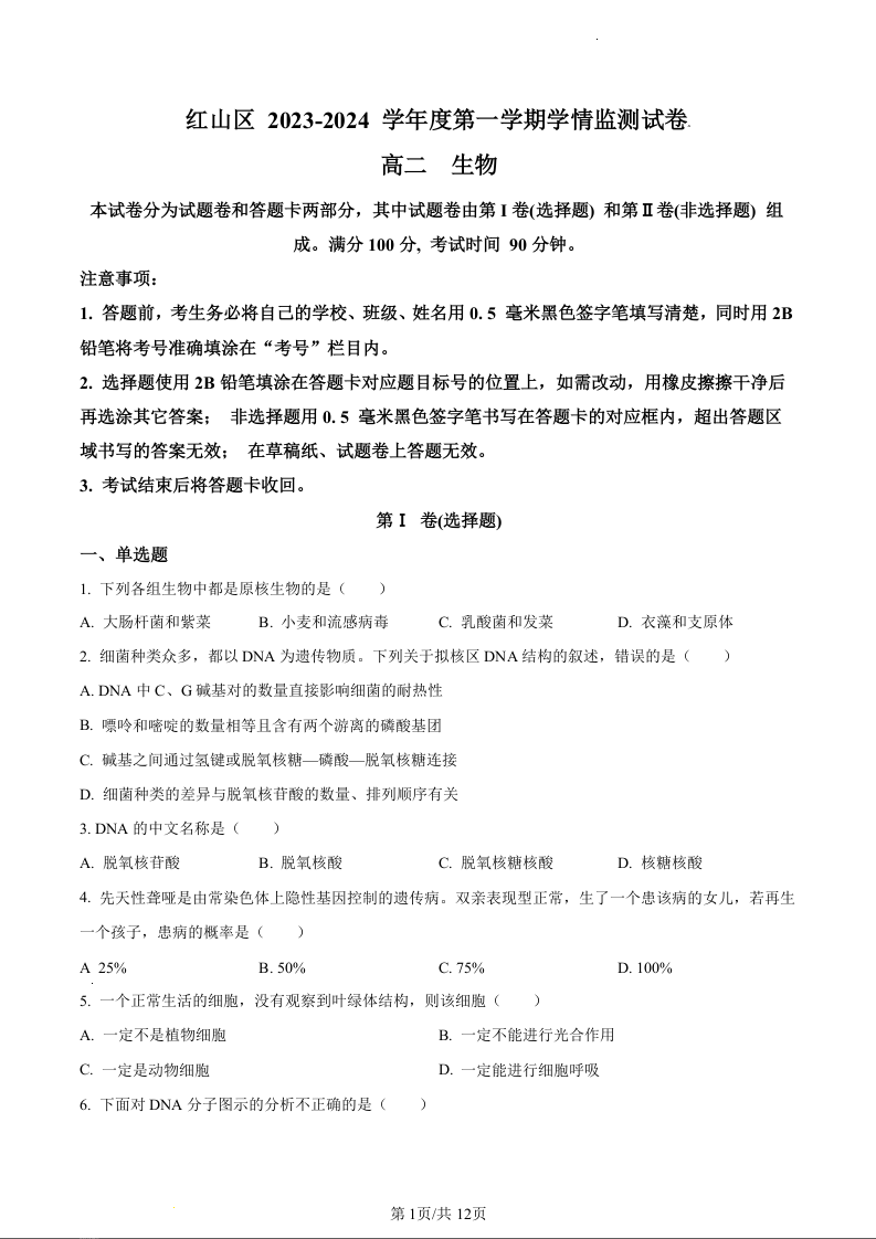 内蒙古自治区赤峰市红山区2023-2024学年高二上学期期末生物(原卷版)