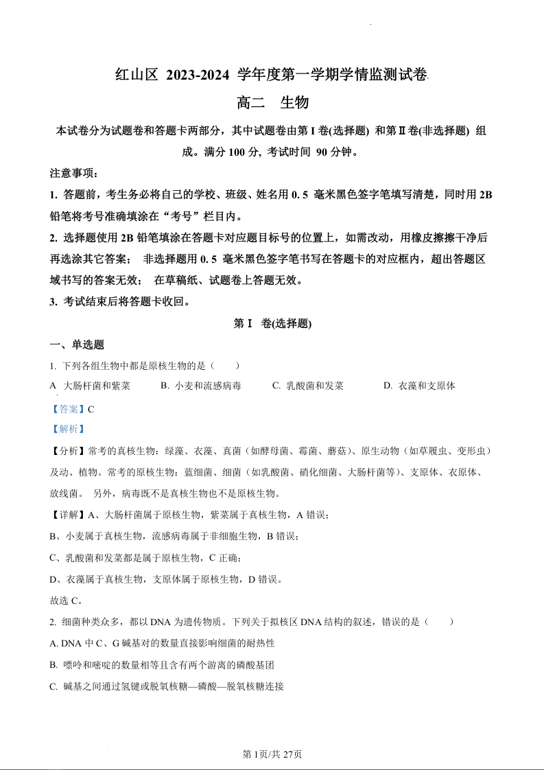 内蒙古赤峰市红山区2023-2024学年高二上学期1月期末考试生物(精品解析版)