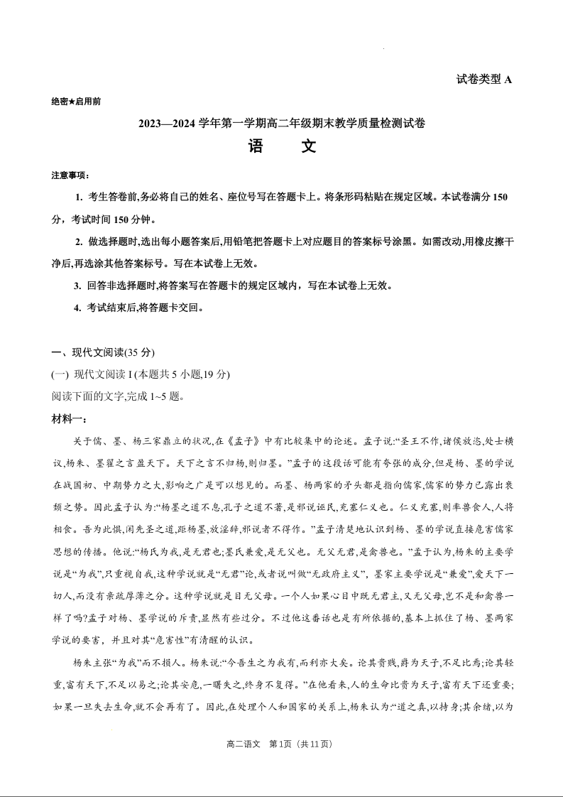 内蒙古锡林郭勒盟2023-2024学年高二上学期1月期末教学质量检测语文