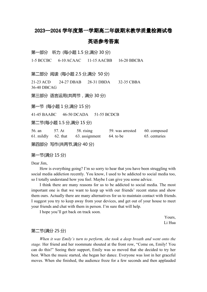内蒙古锡林郭勒盟2023-2024学年高二上学期1月期末教学质量检测英语答案