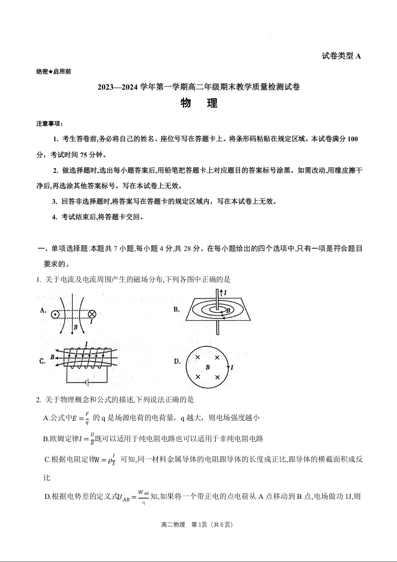 内蒙古锡林郭勒盟2023-2024学年高二上学期1月期末教学质量检测物理