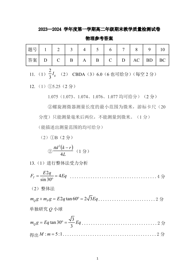 内蒙古锡林郭勒盟2023-2024学年高二上学期1月期末教学质量检测物理答案