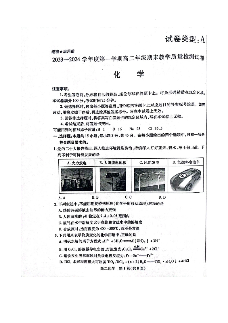 内蒙古锡林郭勒盟2023-2024学年高二上学期1月期末教学质量检测化学