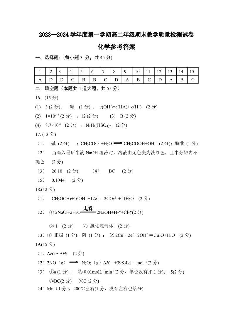内蒙古锡林郭勒盟2023-2024学年高二上学期1月期末教学质量检测化学答案