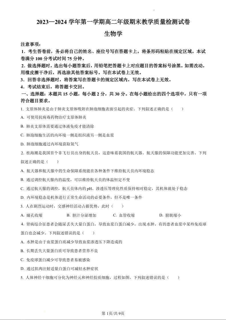 内蒙古锡林郭勒盟2023-2024学年高二上学期1月期末教学质量检测生物(原卷版)