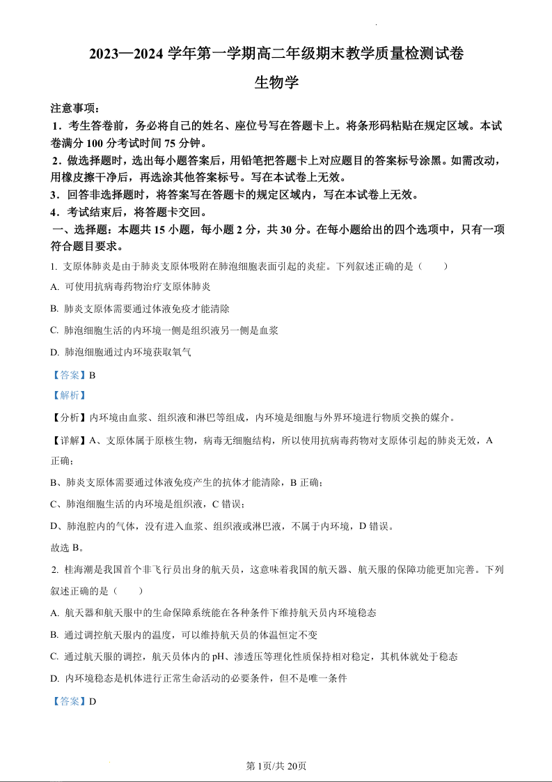 内蒙古锡林郭勒盟2023-2024学年高二上学期1月期末教学质量检测生物(精品解析版)