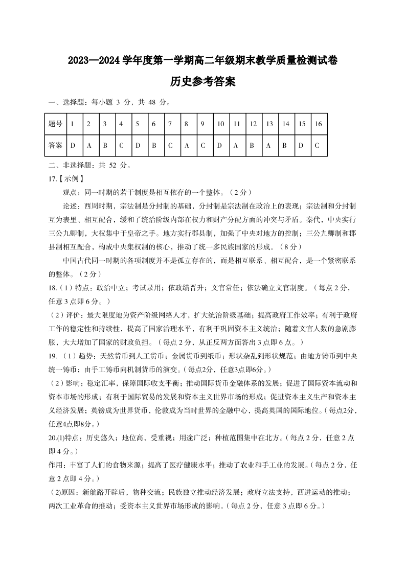 内蒙古锡林郭勒盟2023-2024学年高二上学期1月期末教学质量检测历史答案