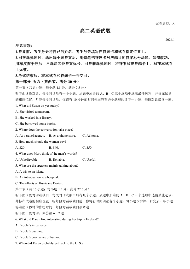 山东省滨州市2023-2024学年高二上学期1月期末考试英语