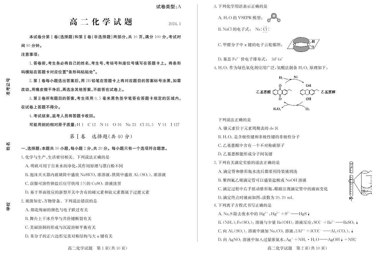 山东省滨州市2023-2024学年高二上学期1月期末考试化学