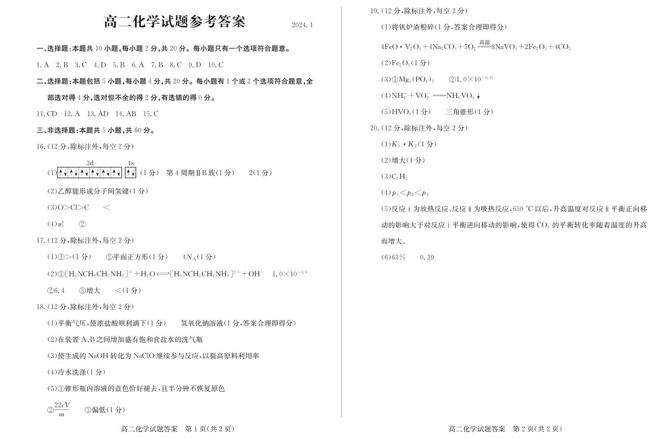山东省滨州市2023-2024学年高二上学期1月期末考试化学答案