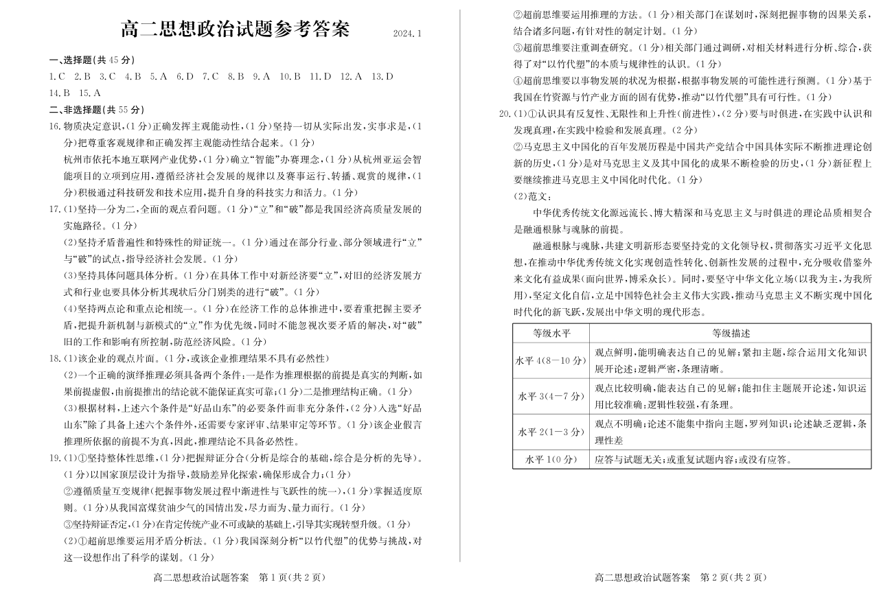 山东省滨州市2023-2024学年高二上学期1月期末考试政治答案