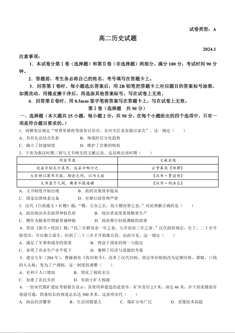 山东省滨州市2023-2024学年高二上学期1月期末考试历史+答案