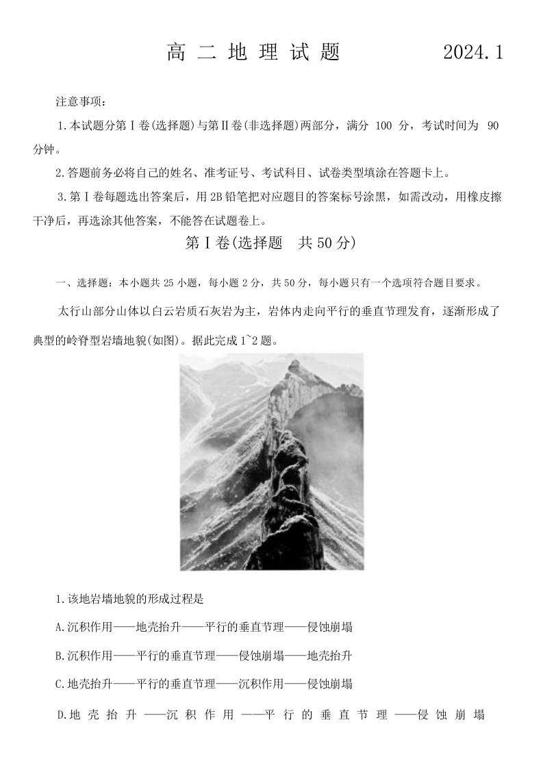 山东省滨州市2023-2024学年高二上学期1月期末考试地理