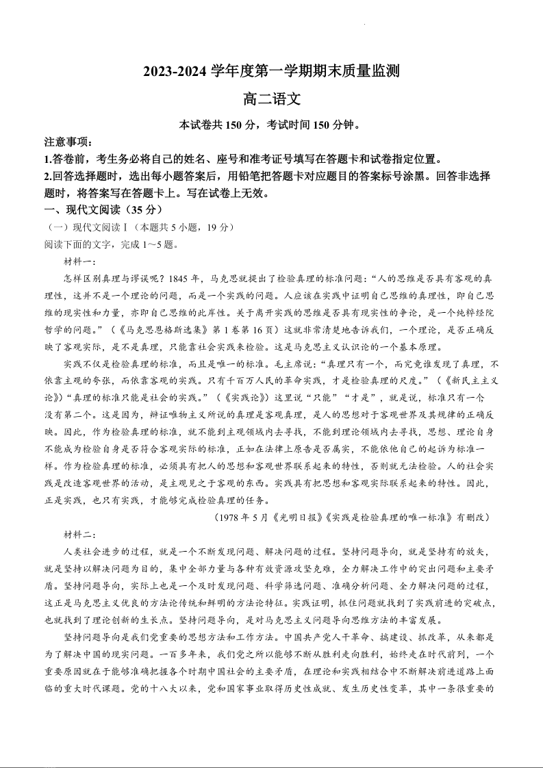 山东省东营市2023-2024学年高二上学期期末考试语文