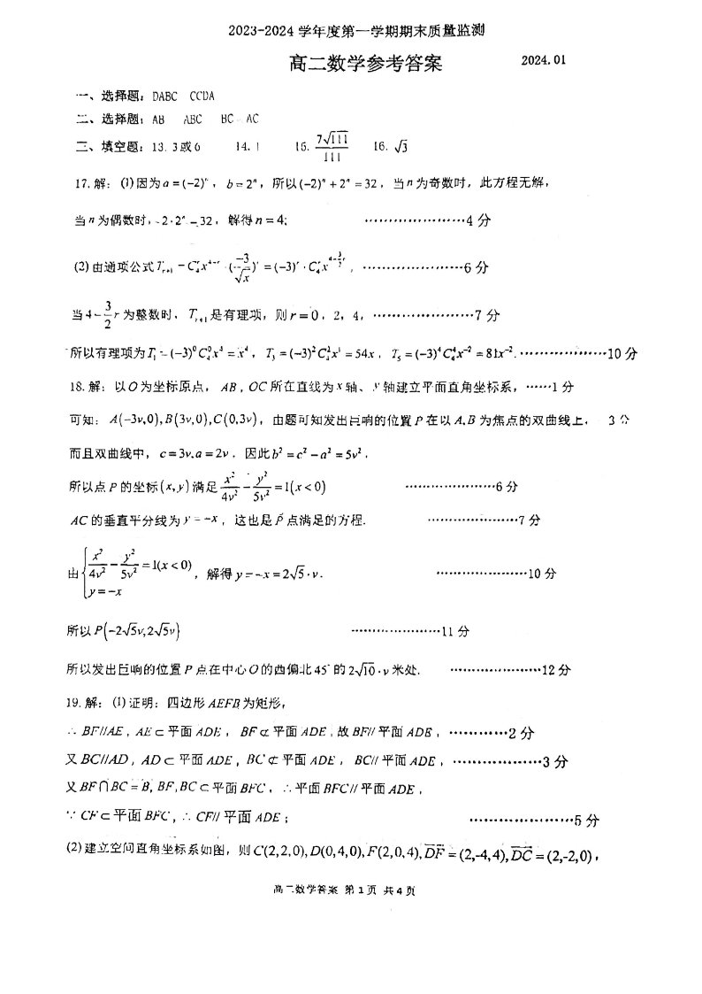 山东省东营市2023-2024学年高二上学期期末考试数学答案