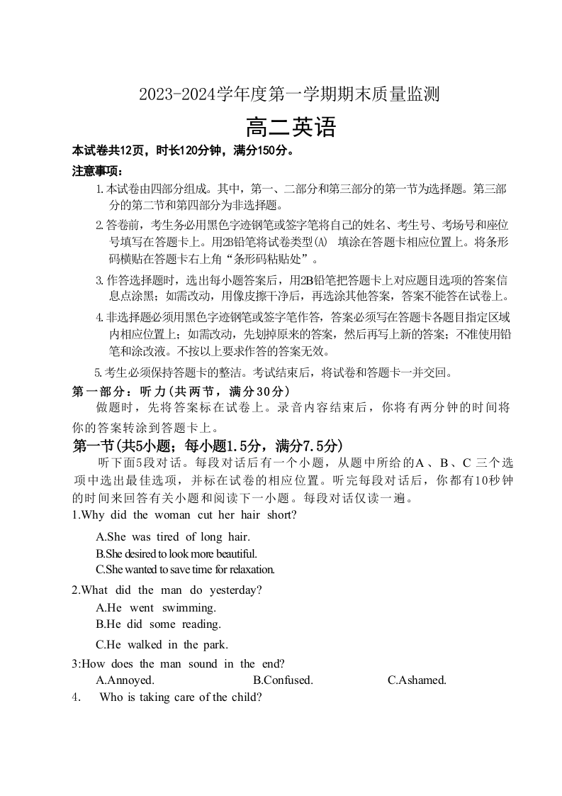 山东省东营市2023-2024学年高二上学期期末考试英语