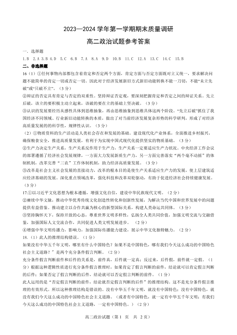 山东省东营市2023-2024学年高二上学期期末考试政治答案
