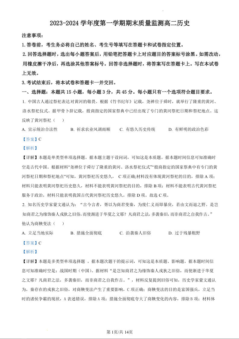 山东省东营市2023-2024学年高二上学期期末考试历史(精品解析版)