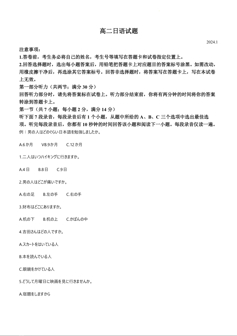 山东省滨州市2023-2024学年高二上学期1月期末考试日语