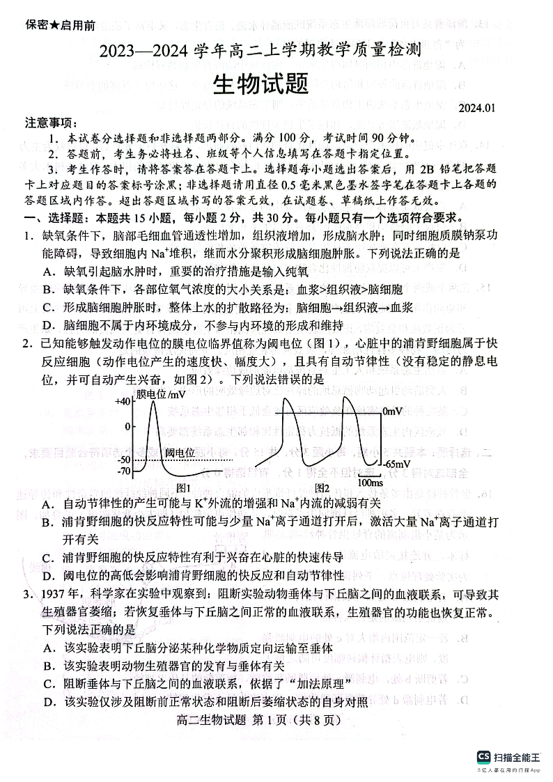 山东省菏泽市2023-2024学年高二上学期教学质量检测生物