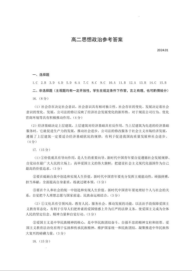 山东省菏泽市2023-2024学年高二上学期教学质量检测政治答案