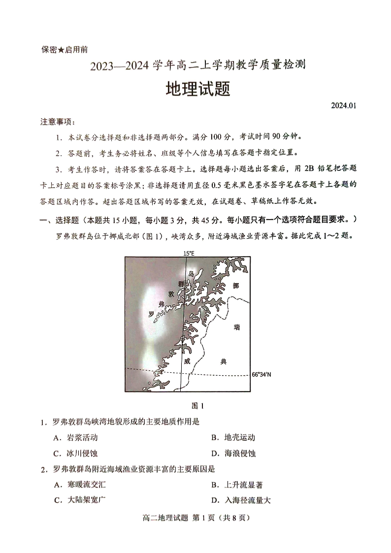 山东省菏泽市2023-2024学年高二上学期教学质量检测地理