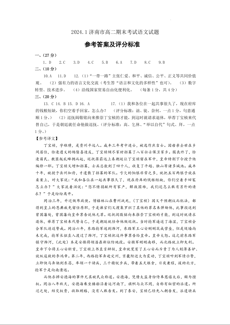 山东省济南市2023-2024学年高二上学期期末考试语文答案