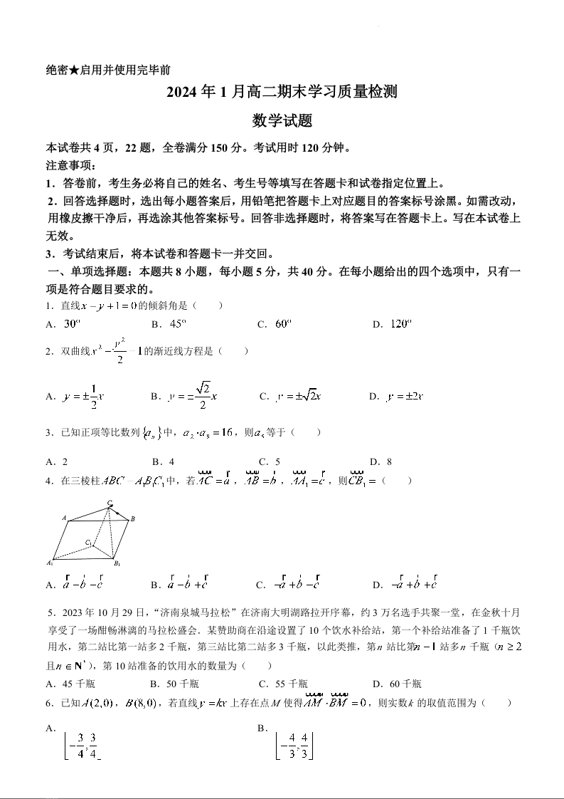 山东省济南市2023-2024学年高二上学期期末考试数学+答案