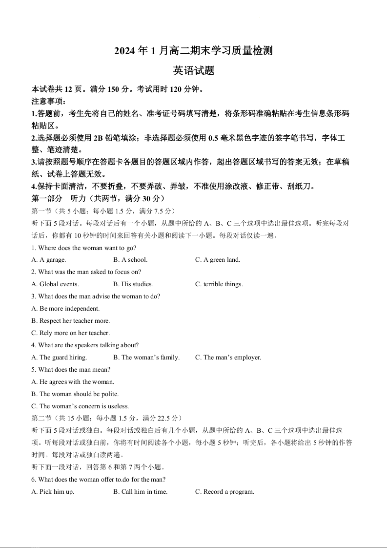 山东省济南市2023-2024学年高二上学期期末考试英语
