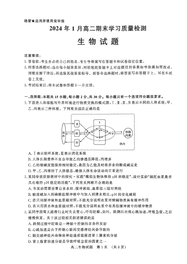 山东省济南市2023-2024学年高二上学期期末考试生物